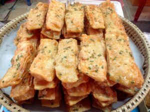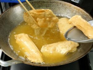 นำไปทอดให้สุ กกรอบเหลือง พักไว้ให้สะเด็ดน้ำมั น