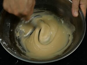 -นำส่วนผสม แป้งสาลี น้ำตาลทราย กะทิ เกลือ น้ำมัน มาผสมรวมตีให้ทั้งหมดเข้ากันจนเนียลประมาณ 30 นาที