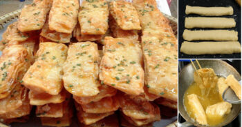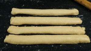 -ปั้นขนาดเท่ากำมือ รี ดแป้งให้บาง จากนั้นใช้มือค ลึ ง ให้เป็นขนาดสี่เหลี่ยม จากนั้นพับแป้งไปมา 3-4 ชั้น