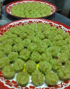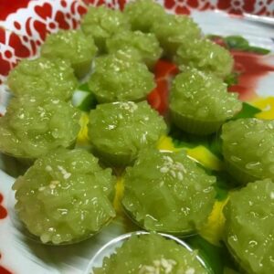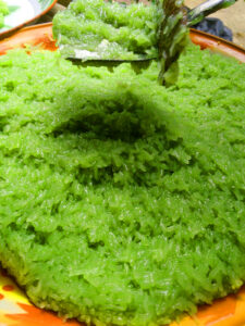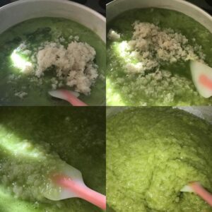 พอได้น้ำกะทิใบเตยให้นำมากรองด้วยผ้าขาวบางกันเ ศ ษใบเตยปนมากับน้ำกะทิ จากนั้น นำกะทิขึ้นตั้งไ ฟ