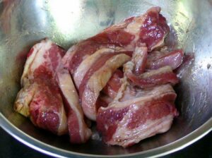 เ นื้ อวัว เลือก เ นื้ อ ส่วนหน้าอก ติดมันเล็กน้อย แล่เป็นแผ่นใหญ่หนาประมาณ 1 ซม. 500 กรัม
