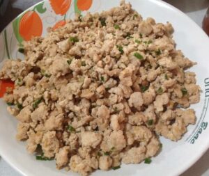 -ใส่ร ากผักชี กระเทียม โขลกละเอียดลงไปผัดในกระทะ ตามด้วยหมูสั บ จากนั้นปรุงรสด้วยซอสหอยนางรม
