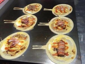 -ตั้งกระทะโดยใช้ไ ฟ อ่อน ๆ ตักแป้งมาหยอดลงกระทะประมาณครึ่งทั พพี ละเลงเป็นรูปวงรี ตามด้วยไข่นกกระทา 1 ฟอง