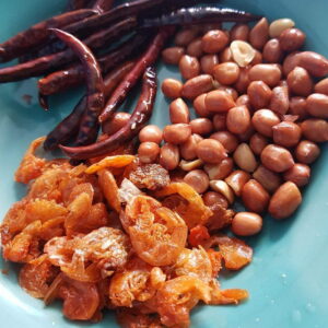 -เริ่มด้วย เจียวกระเทียมให้หอม คั่ วพริกแห้ง คั่ วถั่วลิสง ทอดกุ้งแห้ง พักไว้ก่อน