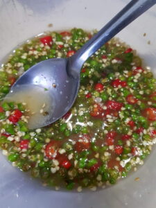 ปริมาณตามความเผ็ดที่ชอบ ตามด้วย มะนาว 4 ส่วน น้ำป ล า 3 ส่วน และน้ำตาลทราย 1.5 ส่วน