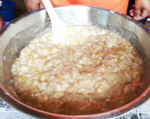 -เทกล้วยบ ดลงไป ใช้พ ายตะล่อมให้กล้วยบ ดกับแป้งเข้ากันดี