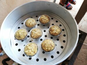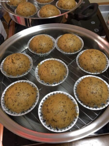 -นำขนมไปนึ่ง ใช้เวลา 15 นาที หากเป็นพิมพ์เล็ก ก็ใช้เวลา 12 นาทีก็พอ หรือสังเกตสีขนมหากเป็นสีน้ำตาลก็ถือว่าสุ กแล้ว