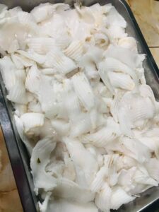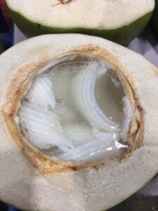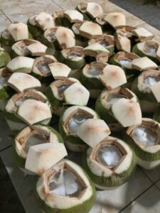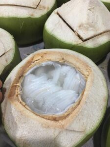-เลือกมะพร้าวอ่อนได้ที่ป อ กให้สวยงาม แช่น้ำซึ่งผสมน้ำส้มสายชู ทิ้งไว้ 5-10 นาที เพื่อไม่ให้เป ลื อ กมะพร้าวดำ