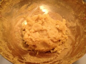 -ทึ้งไว้ให้เย็นแล้วนำถั่วมาปั้นให้รูปวงรีคล้ายๆเม็ดขนุนนำใส่ถาดผึ่งไว้สักพัก