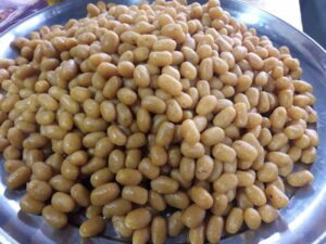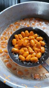 ให้สุ กทั้งสองด้านแล้วจึงตักขนมที่สุ กใส่ในอ่างที่ใส่น้ำเชื่อมสำหรับลอยไว้แช่ขนมไว้สักพักค่อยตักขึ้นใส่จาน
