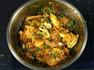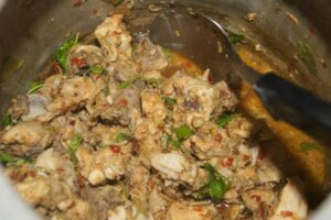 – เอาไก่ที่ค ลุ กกับเครื่องปรุงทั้งหมดเอาใส่หม้อ