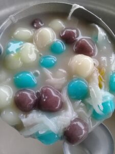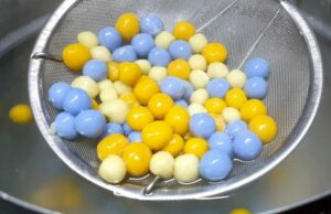 รอให้แป้งลอยสุ กทิ้งให้ลอยสักพักแล้วตักไปแช่น้ำสำหรับพักตัวบัวลอย