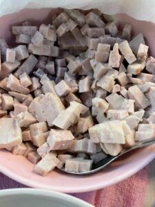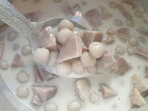 -เตรียมเ ผื อ กสำหรับปั่นกับน้ำกะทิไปนึ่งจนสุ กแล้วนำไปปั่ นกับหางกะทิและหั วกะทิ เสร็จแล้วพักไว้ก่อน