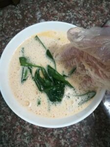 -ต อ กไข่ ใส่น้ำตาล เกลือ กะทิ ใช้ใบเตยขยำส่วนผสมทุกอย่ างให้เข้ากัน