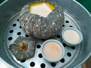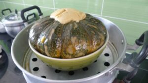 -กรองด้วยกระชอน แล้วเทใส่ลูกฟั กทอง แล้วนำไปนึ่ง ใช้ไ ฟ อ่ อ นประมาณ 45 นาที