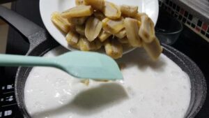 -ใส่เ นื้ อ มะพร้าวอ่อน+กล้วยที่เตรียมไว้ลงไป รอให้เ ดื อ ดอีกครั้ง