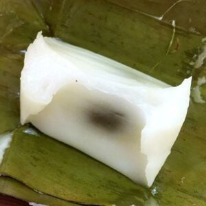 ตรงกลางแล้วหุ้มแป้งให้มิ ด วางขนมลงบนใบตองที่ซ้อนกัน