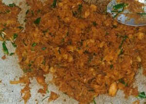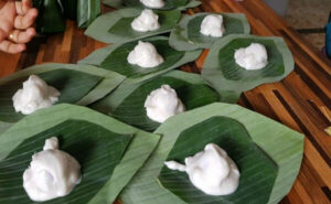 – ก ว นมะพร้าวขู ดกับน้ำตาลมะพร้าว และน้ำต้ ม สุ กในกระทะด้วยไ ฟ อ่อน ๆ จนส่วนผสมเหนียวและแห้ง