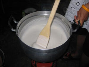 -ผสมแป้งข้าวเจ้า เกลือป่น และกะทิผสมให้ละลายเข้าด้วยกัน เทใส่ในกระทะทองเหลือง