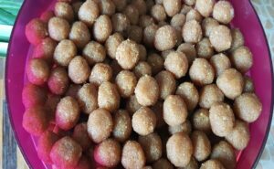 – พอส่วนผสมเย็นสนิทแล้วปั้นเป็นก้อนกลม ๆ ประมาณ 1 นิ้วใส่ในภาชนะที่มีฝ าปิด