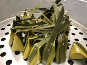 – ห่อใบตองเป็นทรงสูง ใช้ใบมะพร้าวที่เตรียมไว้ค าดและก ลั ดด้วยไม้ก ลั ดให้เรียบร้อย ตั ดปลายเ ตี่ ย วให้เฉียง