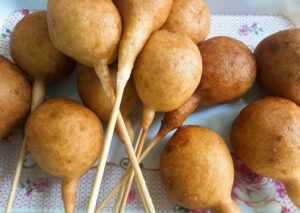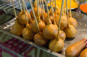 – นำไ ส้ กรอกที่เ สี ย บไม้แล้วจุ่มลงไปในแป้ง แล้วหมุนขึ้นมาให้แป้งไหลไปที่ไม้