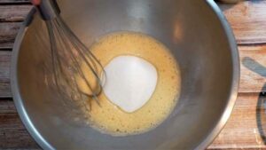 -ตีไข่ให้ขึ้นฟูจนเป็นสีเหลืองอ่อนๆ แล้วค่อยๆใส่น้ำตาลกับเกลือลงไปทีละนิดสลับกับคนไปด้วย