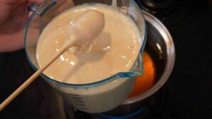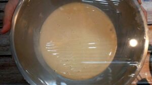-นำแป้งที่ร่ อ นรวมไว้มาใส่สลับกับนม ใส่ที่ละนิดสลับกันไปจนแป้งและนมหมด คนให้เนียน