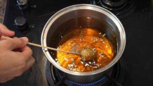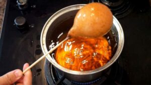 -แล้วนำไปทอดในน้ำมั น ต้องค่อยๆหมุนให้แป้งโดนน้ำมั น ทอดจนแป้งสุ กเป็นสีเหลืองทองแล้วนำขึ้นมาพักไว้
