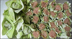 -จากนั้นให้นำหมูที่หมักไว้เรียบร้อยแล้ว มาห่อด้วยแผ่นเกี๊ยว และทำการตกแต่งด้วยเ นื้ อปูด้านบน