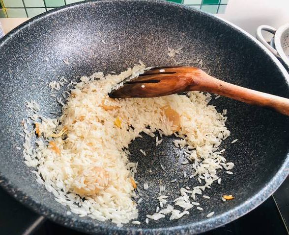 -นำข้าวที่ผัดเสร็จใส่หม้อหุงข้าว ใส่น้ำให้เท่ากับปริม าณข้าวที่เตรียมไว้ (เหมือนหุงข้าวปกติ)