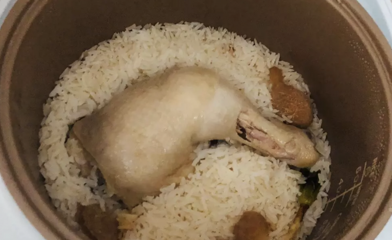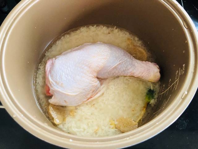 หลังจากนั้นนำไก่ที่ล้างและพักไว้ใส่ลงไปด้านบน นำไปหุงปกติ
