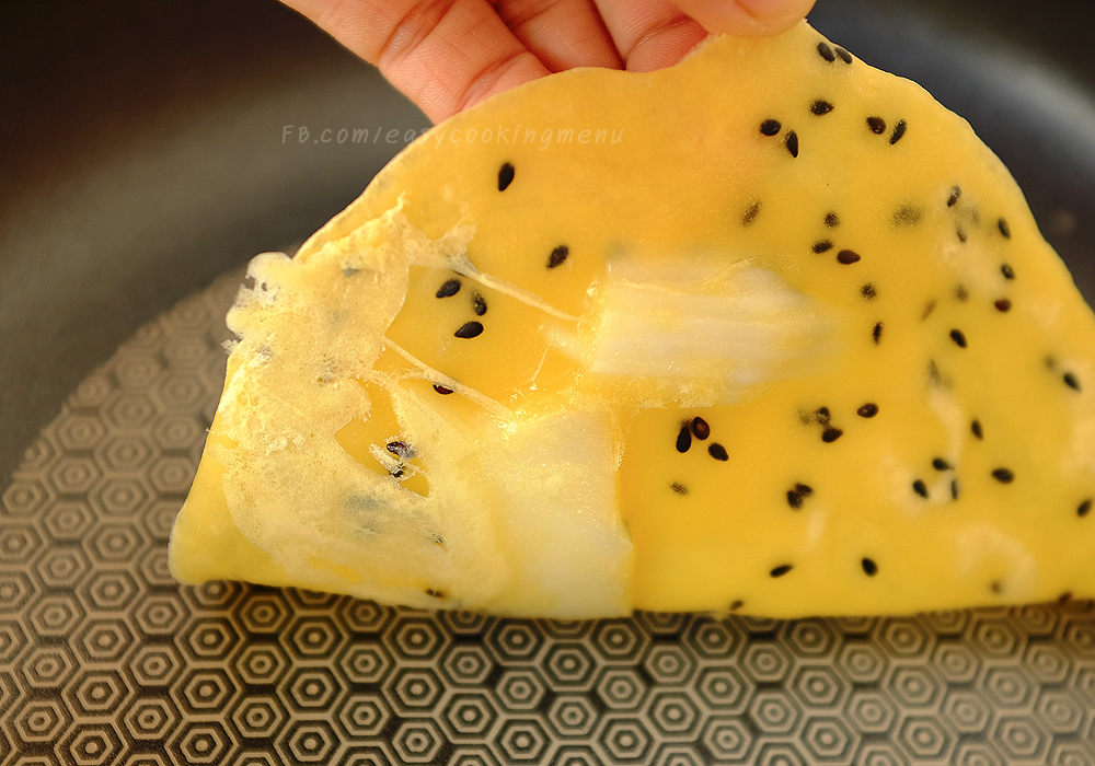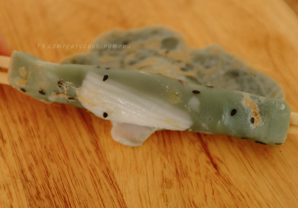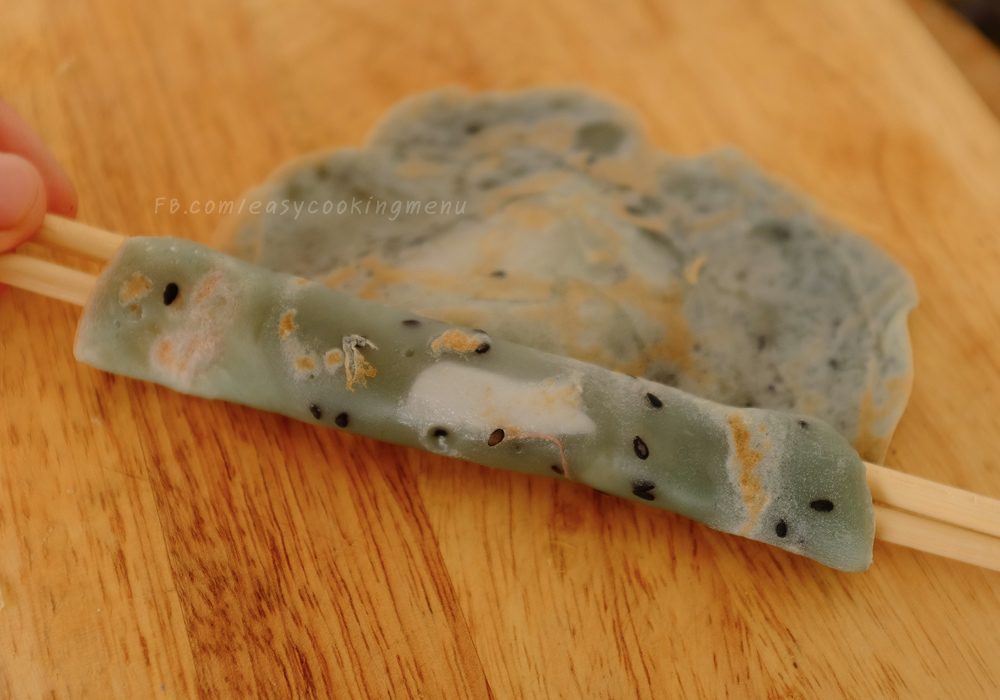 4.นำไปวางที่เขียง ทีนี้ก็มาถึงขั้นตอนม้วน ดูตามภาพ ใช่ตะเกียบสองอัน คี บชิ้ นทองม้วนขึ้นมา