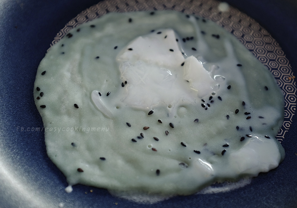 1.ผสม กะทิ เกลือ น้ำตาล ใช้ตระกร้อมือตีให้เข้ากัน จากนั้นใส่ไข่ตีให้เข้ากัน และนำไปใส่ในช ามแป้งทีละน้อย