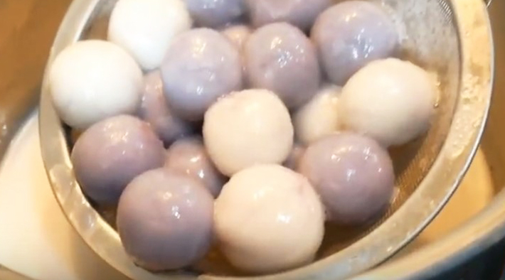 7.ต้มแป้งโดยใส่น้ำเปล่าในหม้อต้มจนเ ดื อ ด แล้วค่อยนำแป้งที่ปั้นไว้ลงไปต้มให้สุ ก สังเกตุว่าถ้าแป้งลอยแสดงว่าสุ กแล้ว