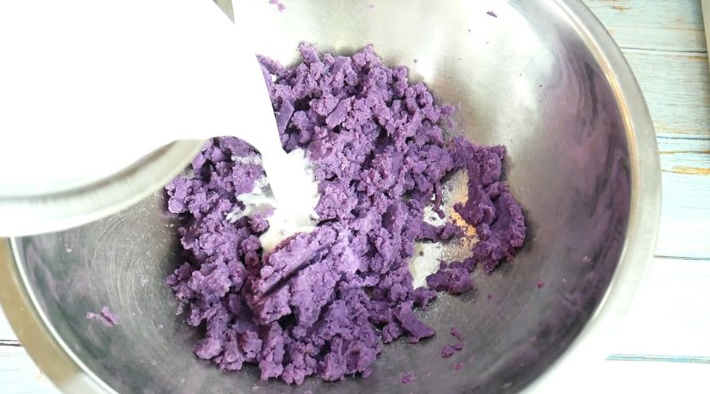 1.ปอกเปลือกมันม่ ว ง หั่ นเป็นชิ้ น แล้วนำไปนึ่งจนสุ ก แล้วนำมาบ ดให้ละเอียดเติมกะทิ และน้ำตาลทราย ลงไปคนให้เข้ากัน