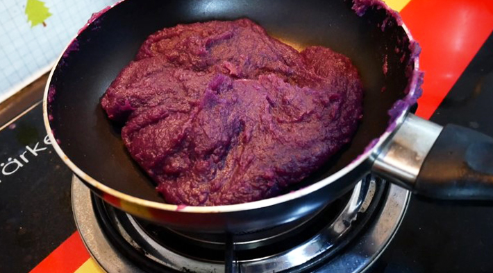 2.นำมันม่วงขึ้นใส่กระทะ (กระทะเทฟล่อน หรือ กระทะทองเหลือง) กวนโดยใช้ไ ฟอ่อนกวนมันม่วงจนแห้ง