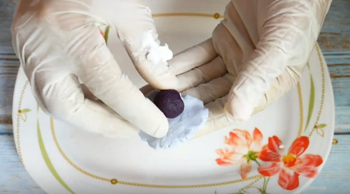 5.ปั้นแป้งเป็นก้อนแล้วกดให้แบน ใส่ไ ส้มันม่ ว งแล้วห่อไม่ให้เห็นไ ส้มันม่ ว ง