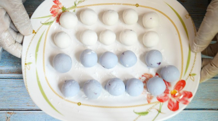 4.ผสมแป้งข้าวเหนียวครึ่งหนึ่ง และน้ำอัญชัน อีกครึ่งหนึ่งผสมกับน้ำเปล่า นวดให้แป้งนิ่มพร้อมปั้นก้อน