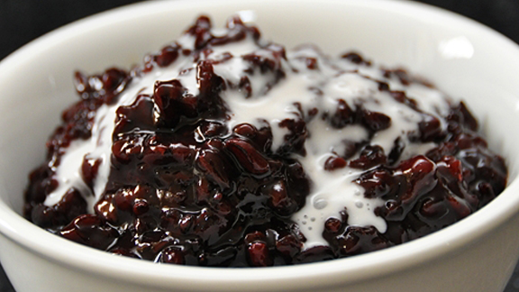 4.ตักข้าวเหนียวดำใส่ถ้วย ราดด้วยน้ำกะทิ กินตอนอุ่นๆ ก็อร่อย หรือแช่ตู้เย็นก็ได้