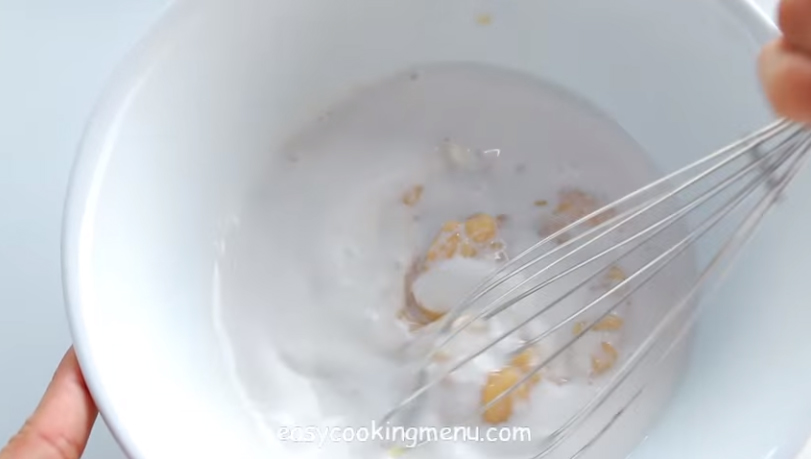 1.นำกะทิ น้ำตาล และเกลือ ใส่ในช ามผสม คนให้เข้ากัน จนน้ำตาลละลาย