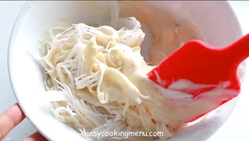 2.ใส่เ นื้ อมะพร้าวขู ด ลงไปผสมให้เข้ากัน เคล้าให้เข้ากันอีกครั้งผสมมะพร้าวลงไปจนน้ำกะทิดูไม่โหลงเหลง