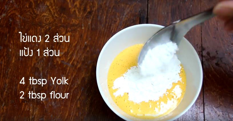 2.ผสมแป้งข้าวเจ้า 4 ส่วน กับแป้งข้าวเหนียว 1 ส่วนเข้าด้วยกันแล้วนำไข่แดง 2 ส่วน กับแป้ง 1 ส่วน ลงไปตีผสมให้เข้ากัน