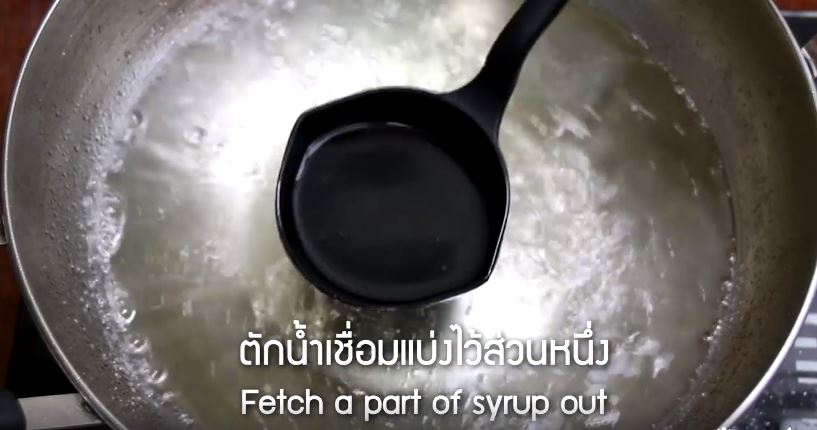เป็นน้ำเชื่อมข้นตักแบ่งน้ำเชื่อมออกมาใส่ถ้วยไว้ส่วนหนึ่ง สำหรับแช่ทองหยอด