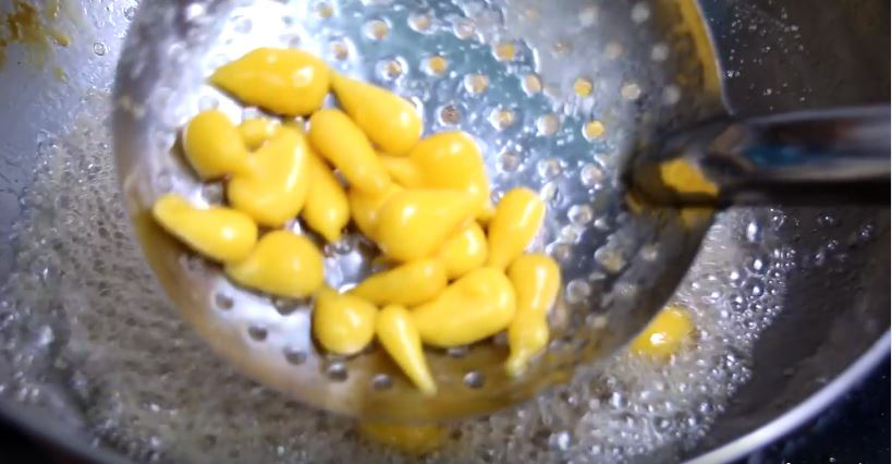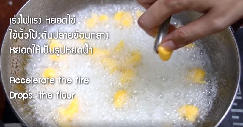 ดันปลายช้อนกลาง หยอดให้เป็นรูปหยดน้ำ ลงไปในกระทะเพื่อให้ความหวานของน้ำเชื่อมซึมเข้าไปในแป้ง