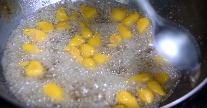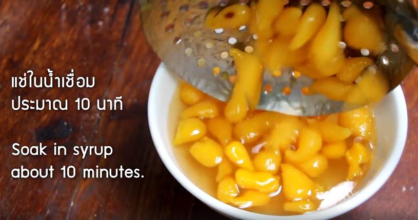 5.ใช้กระชอนตักออกจากกระทะแช่ในน้ำเชื่อมที่แยกไว้ อีกประมาณ 10 นาที