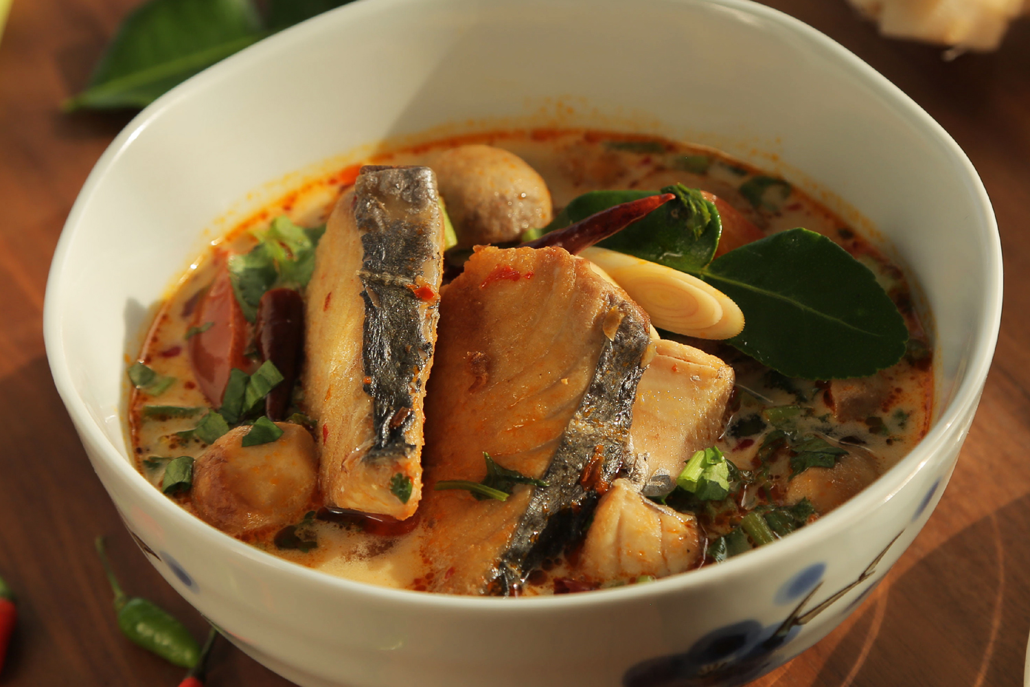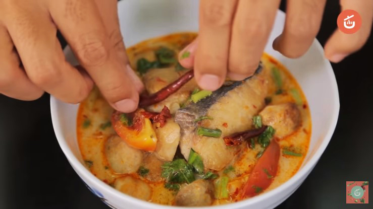 6.ตักใส่ถ้วย ตกแต่งด้วยตะไคร้หั่ นเฉียง ใบมะกรูด และพริกขี้หนูแห้งทอด ได้เลย