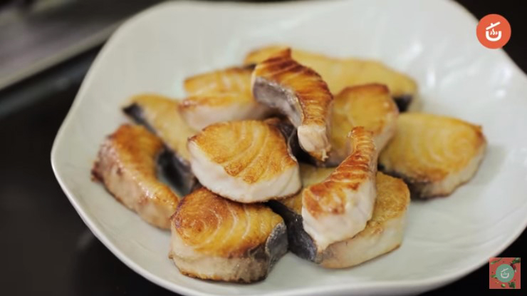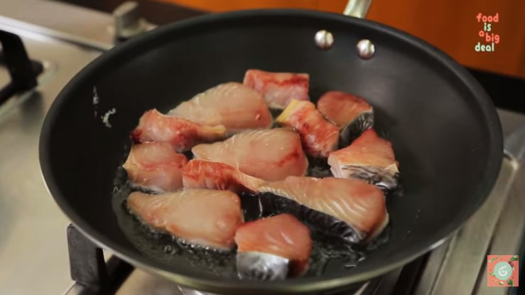 2.ตั้งกระทะเทฟล่อน ใช้ไ ฟแ ร ง ใส่น้ำมันพืชลงไป พอร้อนใส่เ นื้ อป ล าลงทอด
