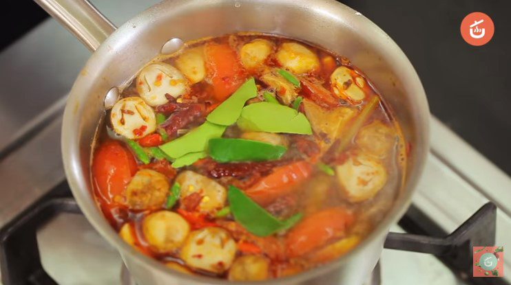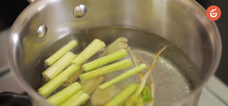 3.ตั้งหม้อใส่น้ำ ใช้ไ ฟกลาง รอจนเ ดื อ ด ใส่ตะไคร้ ข่ า และร ากผักชี ต้ม 2 นาทีพอมีกลิ่นหอม