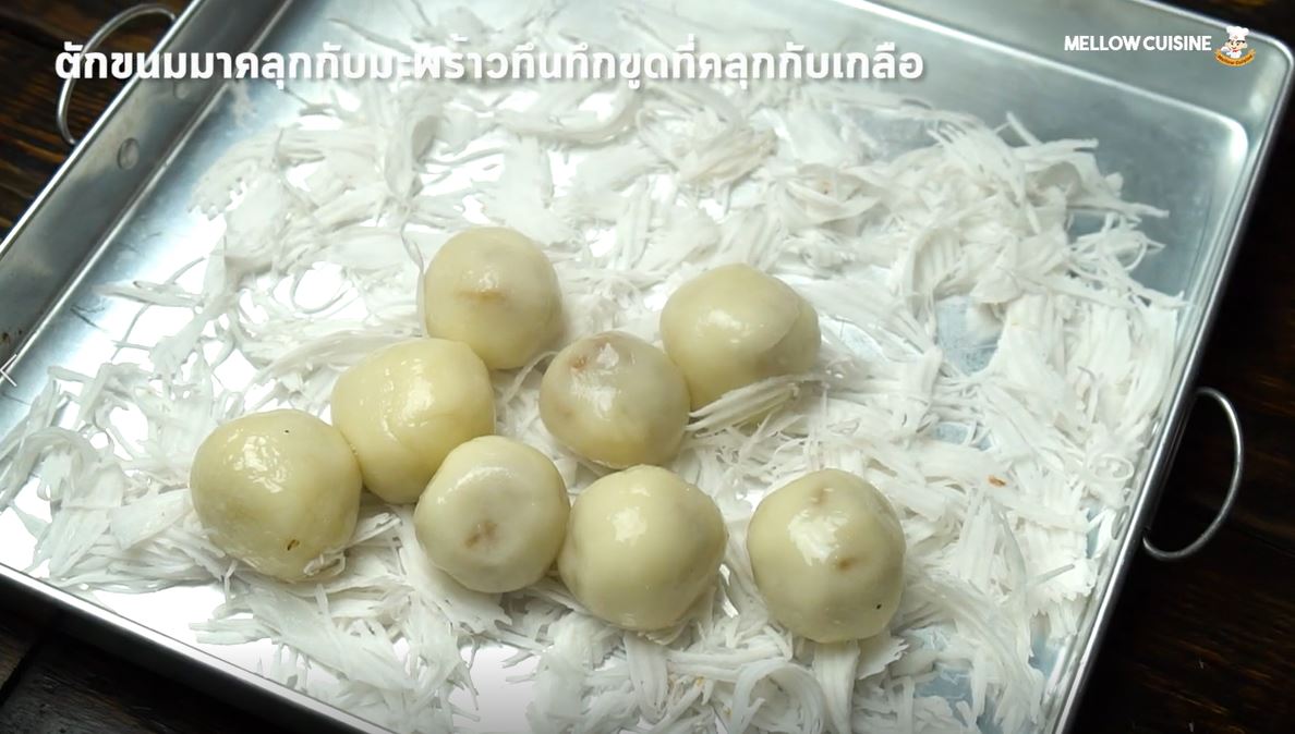 เตรียมมะพร้าวขุ ดเพื่อคลุกกับขนมน้ำขนมต้มมาค ลุ กเคล้ากับมะพร้าวขู ดที่เตรียมไว้